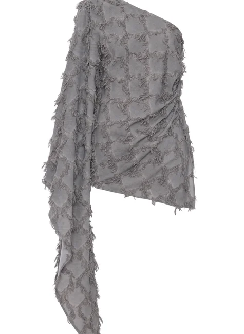 Blusa um ombro confeccionada em tecido Destroyed, que combina estrutura e textura. O modelo apresenta decote de manga única com comprimento alongado e abertura interna que forma uma fenda sutil. Abaixo do busto, o drapeado lateral acrescenta textura e movimento, enquanto a barra assimétrica em linha diagonal cria um visual moderno e marcante.