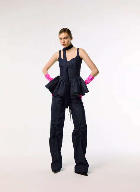 Confeccionada integralmente em jeans, a peça apresenta base estruturada e visual moderno. O tecido valoriza o desenho da calça e sustenta o efeito franzido com consistência.