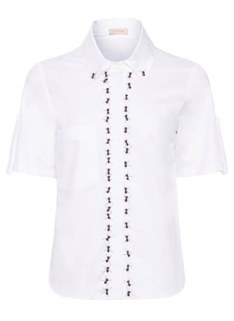 Bordados de formiga no centro e gola, punhos e gola entretelados, botões de massa personalizados e barra tipo lenço com pesponto delicado.