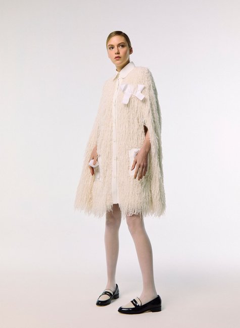 Casaco em pluma com proposta delicada e elegante, pensado para composições sofisticadas. O modelo apresenta gola com abotoamento central que valoriza a linha do colo com discrição. As aberturas laterais permitem a passagem dos braços, criando um visual leve e contemporâneo. O destaque fica por conta dos laços em fita de gorgurão aplicados nos bolsos e no ombro direito, que acrescentam feminilidade e um toque de delicadeza ao modelo. Uma peça especial para sobreposições elegantes em ocasiões refinadas.