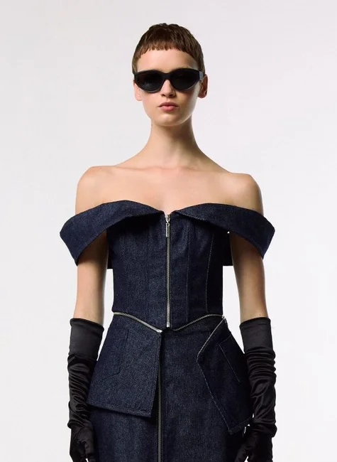 Corselet em jeans com proposta moderna e desenho marcante. O modelo apresenta decote ombro a ombro formado por gola estruturada, com abertura em V no centro que valoriza o colo e acrescenta um ponto de interesse ao visual. O corpo estruturado acompanha as linhas da peça e cria uma silhueta bem definida. Abaixo da cintura, o peplum removível traz versatilidade ao modelo, permitindo diferentes leituras de styling. Nas laterais, a peça conta com bolsos discretos que se integram ao design. Uma peça de atitude contemporânea, pensada para produções urbanas com informação de moda.