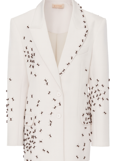Paletó em alfaiataria que conta com ombreiras para estrutura e mangas longas. Possui fechamento por botões de massa, além de dois bolsos frontais — um diagonal na altura do busto e outro com lapela na altura do quadril. Bordado de miçangas semelhante a formiga por todo corpo da peça. Elástico no pulso que possibilita estilizar o tamanho da manga.