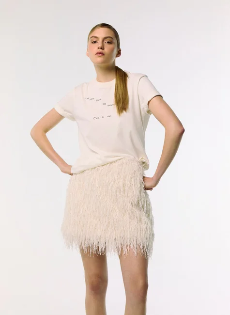 Confeccionada em pluma lurex, a saia apresenta superfície com brilho delicado e textura sofisticada. O tecido reforça a leitura elegante da peça e acrescenta luminosidade na medida certa.