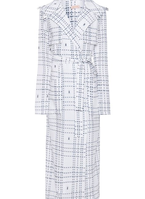 Trench coat confeccionado em Silk Xadrez, com design sofisticado e atemporal. O modelo apresenta lapela estruturada, ombreiras e mangas alongadas que reforçam a alfaiataria de precisão da marca. O recorte em sobreposição no busto adiciona movimento e volume sutil, enquanto o cinto em tecido duplo marca a cintura, realçando a silhueta feminina. A estampa xadrez com formigas traz personalidade moderna ao clássico casaco nessa versão de verão.