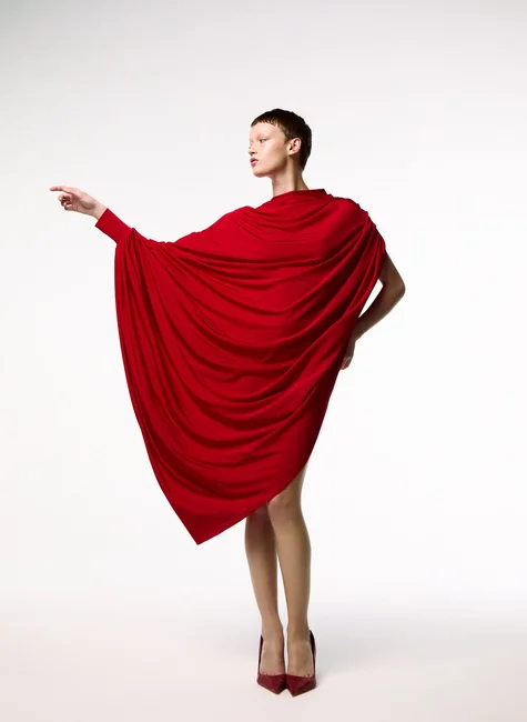 Vestido em jersey com comprimento na altura do joelho e proposta moderna. A modelagem ampla valoriza o movimento da peça, enquanto o drapeado concentrado no ombro cria um ponto de interesse elegante. O design assimétrico aparece nas mangas: de um lado, manga com punho; do outro, abertura fluida que reforça a leveza do visual. Uma peça versátil, com ótimo caimento e leitura contemporânea para produções do dia à noite.