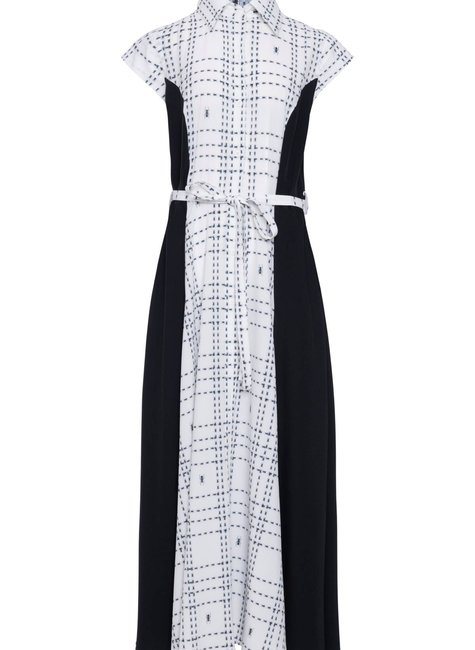 Vestido midi confeccionado em Silk Xadrez e Alfaiataria Madrid, unindo leveza e estrutura em um design contemporâneo. O modelo apresenta gola clássica de camisa, mangas curtas e fechamento frontal por botões de massa. A cintura é marcada por faixa para amarração, destacando a silhueta de forma natural, enquanto os bolsos laterais adicionam praticidade ao visual elegante. Um equilíbrio perfeito entre casual e sofisticado.